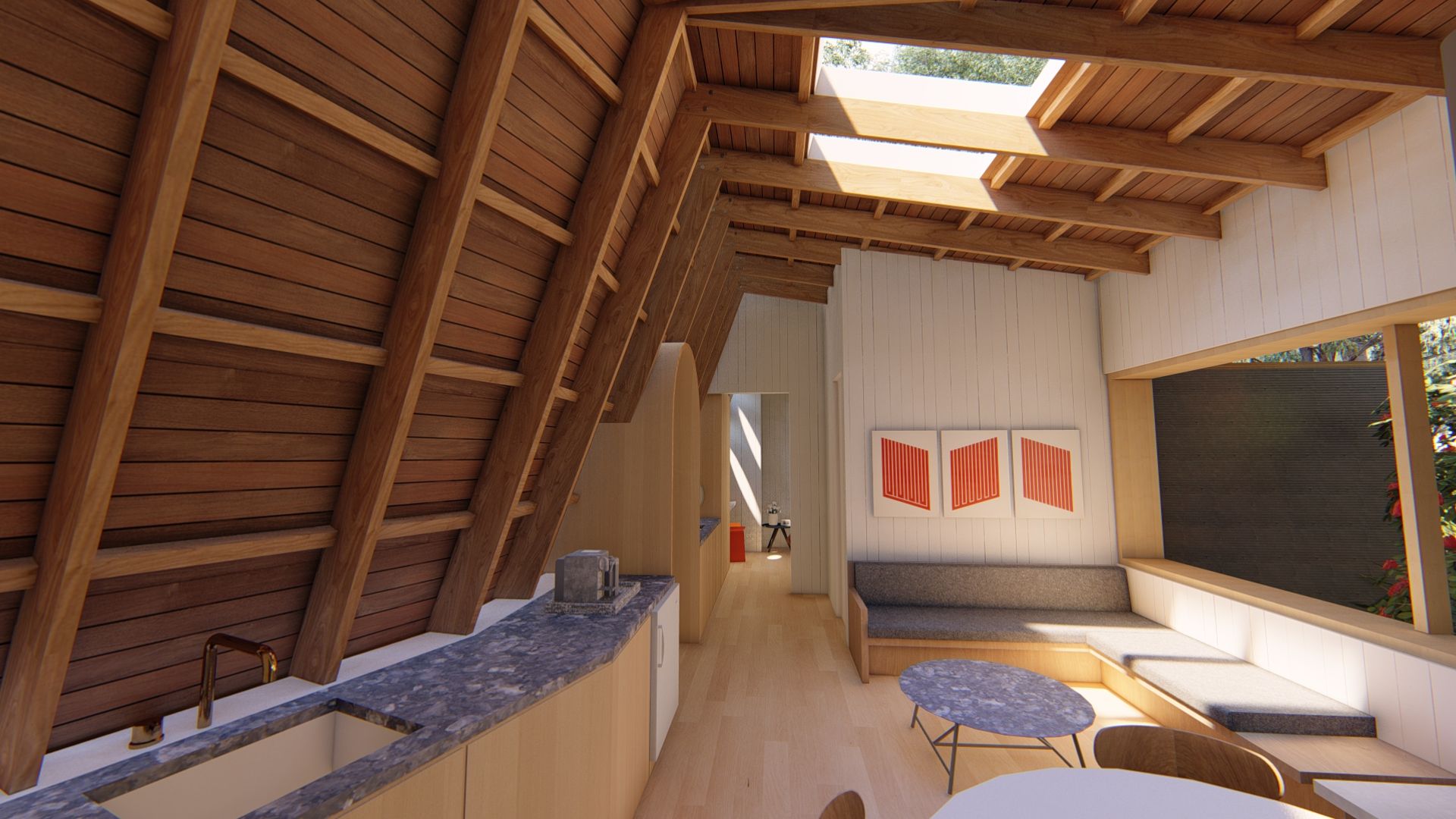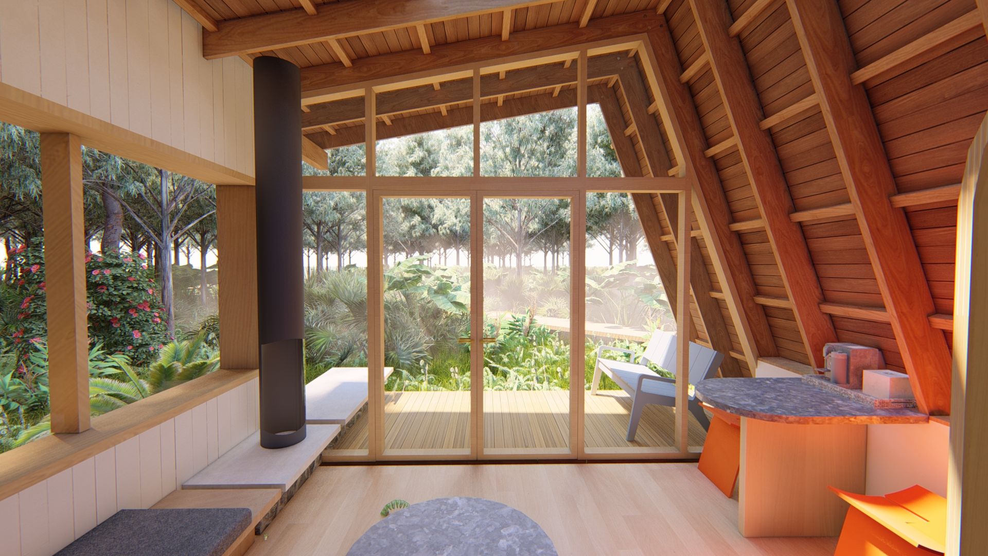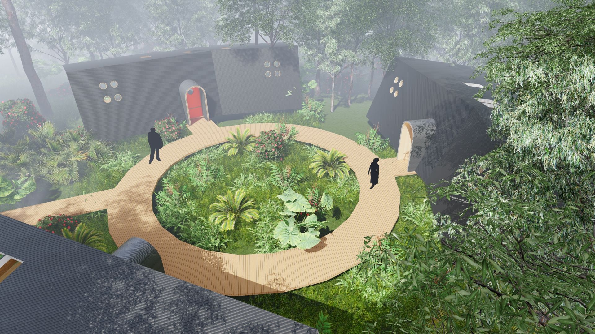 Tucked into the lush jungle of Hawai‘i’s Big Island, this eco-lodge is composed of a series of small, standalone cabins connected by raised walkways that meander gently through the landscape. Each structure is framed and clad in exposed local hardwoods, grounding the architecture in its volcanic, tropical context. The curved forms, deep overhangs, and open-air interiors create a quiet immersion in nature—light, wind, and vegetation flow seamlessly through every space. The lodge offers a low-impact, highly tactile retreat that celebrates the island’s materials, climate, and ecology.