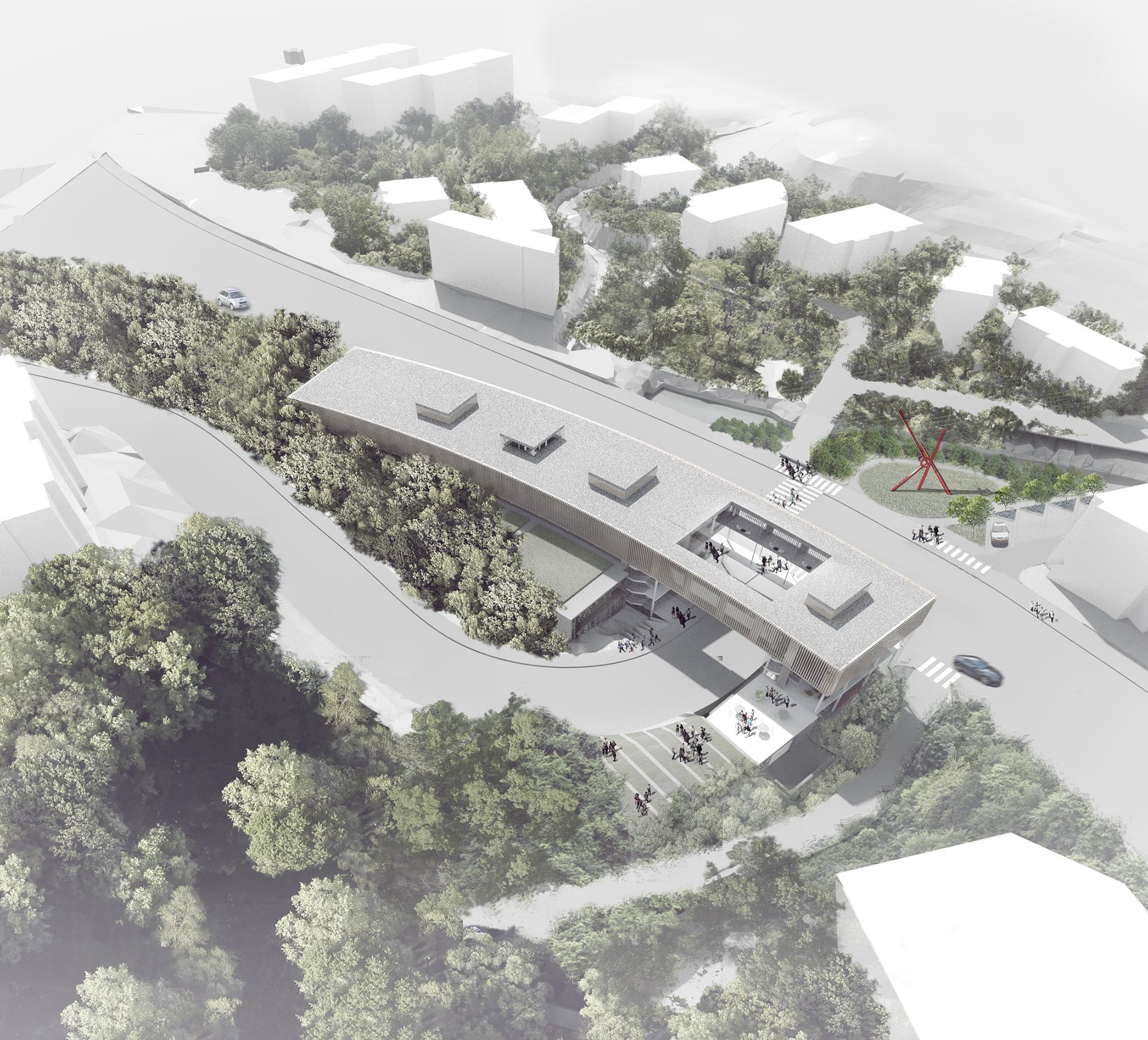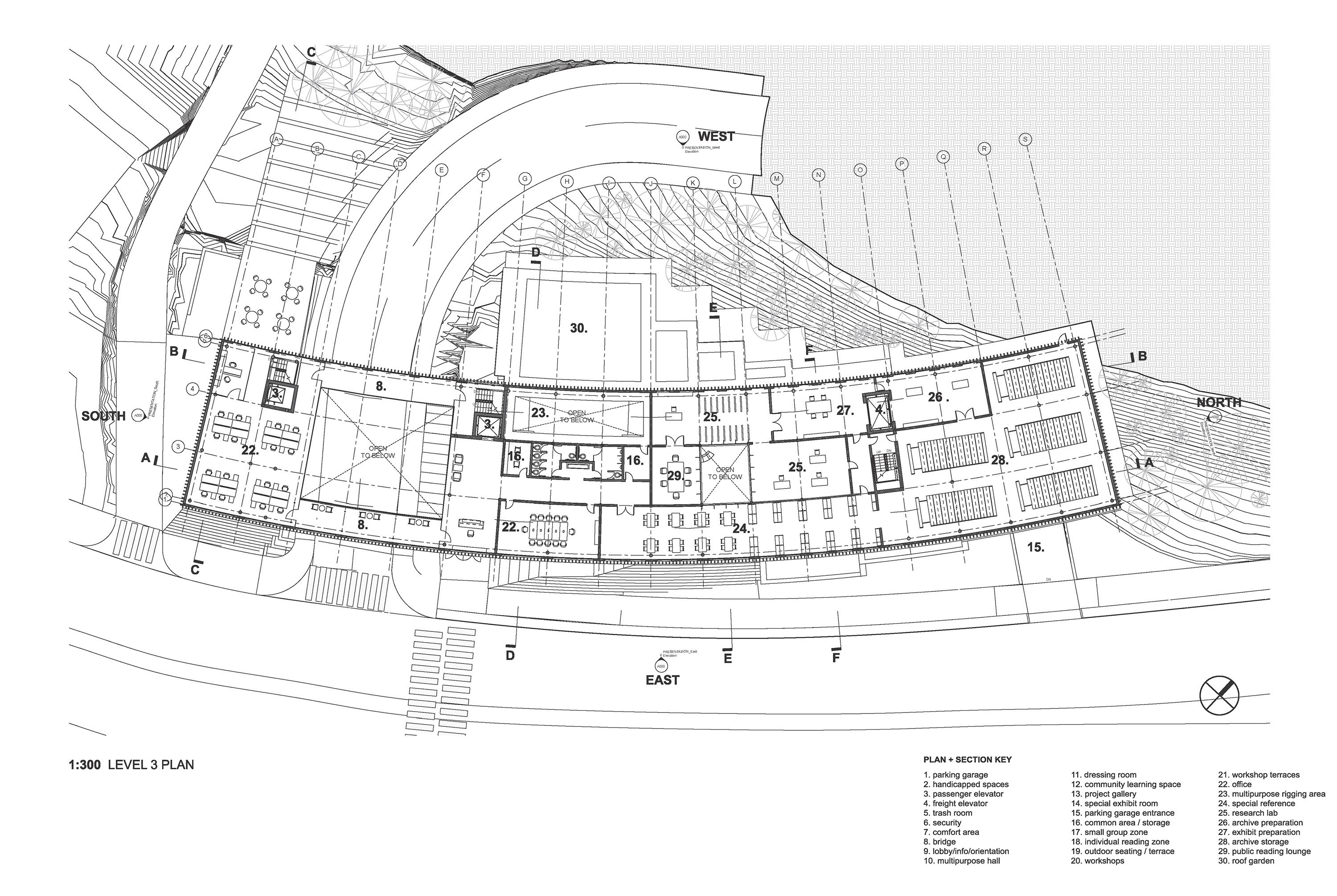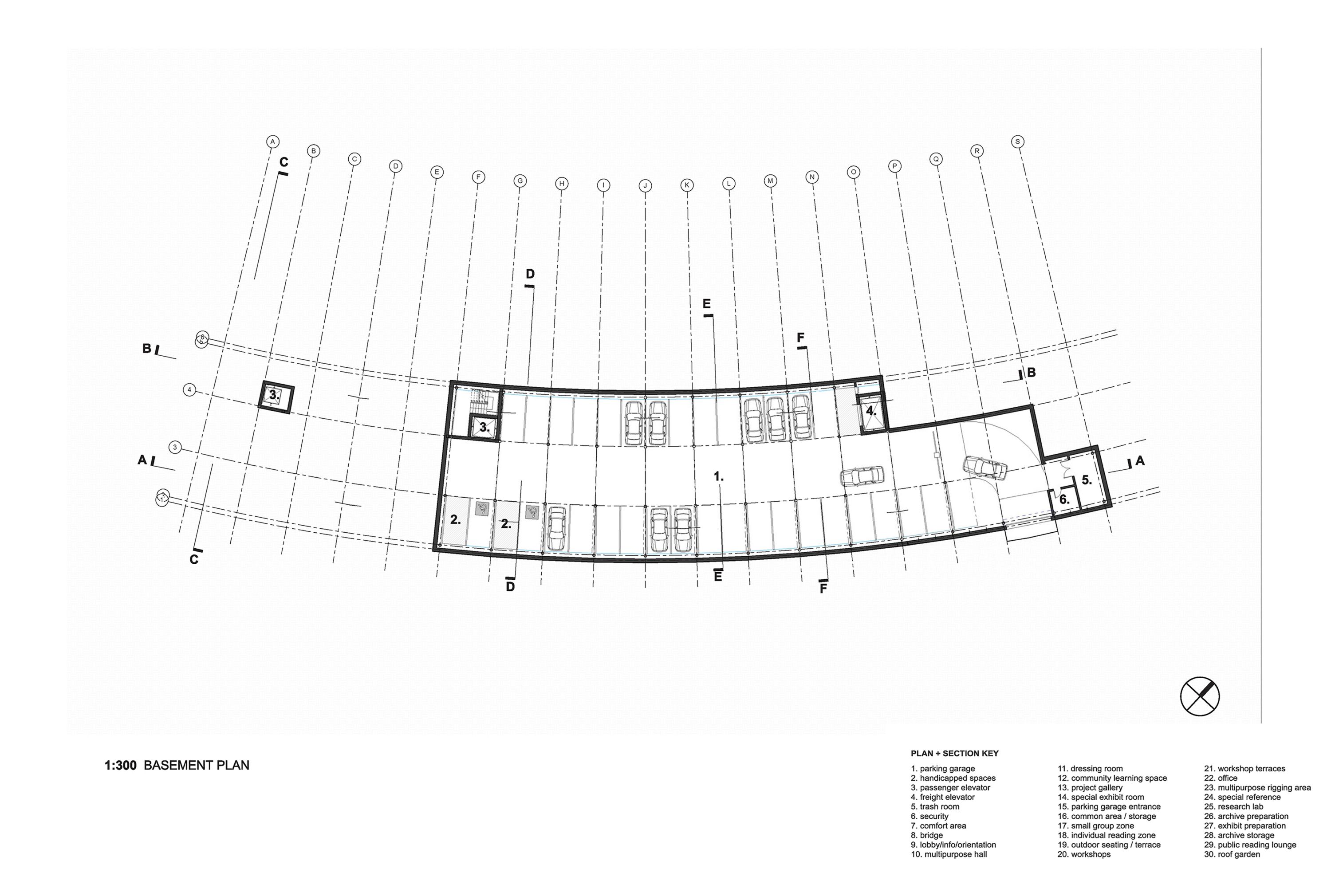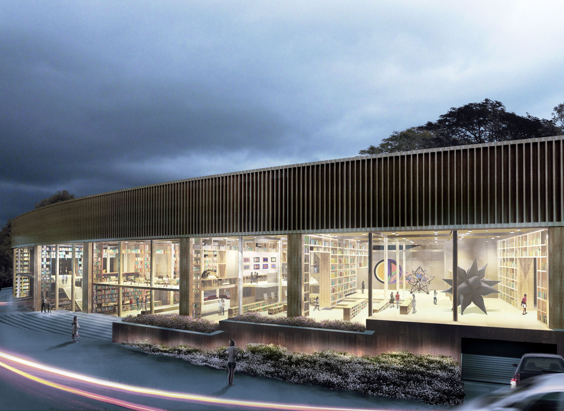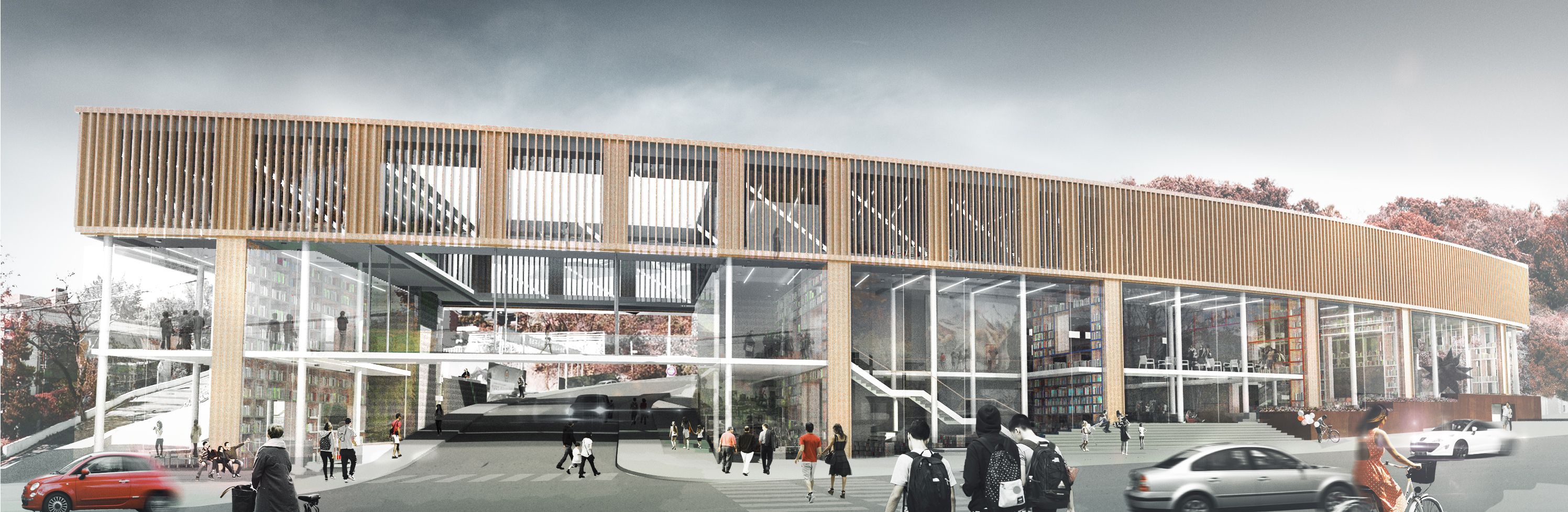 This proposal for a Korean art research complex organizes the building around a series of monumental, inhabitable bookcases that act as walls, galleries, and archives all at once. Instead of hiding collections in back rooms, the building brings art, books, and artifacts into full public view—turning circulation spaces into open archives. A transparent, glassy ground floor creates a welcoming civic presence and seamless connection to the street, while the upper level houses research and administrative spaces within a more solid, monolithic volume. The result is a hybrid between library, museum, and workspace—an architecture of display, discovery, and cultural memory.