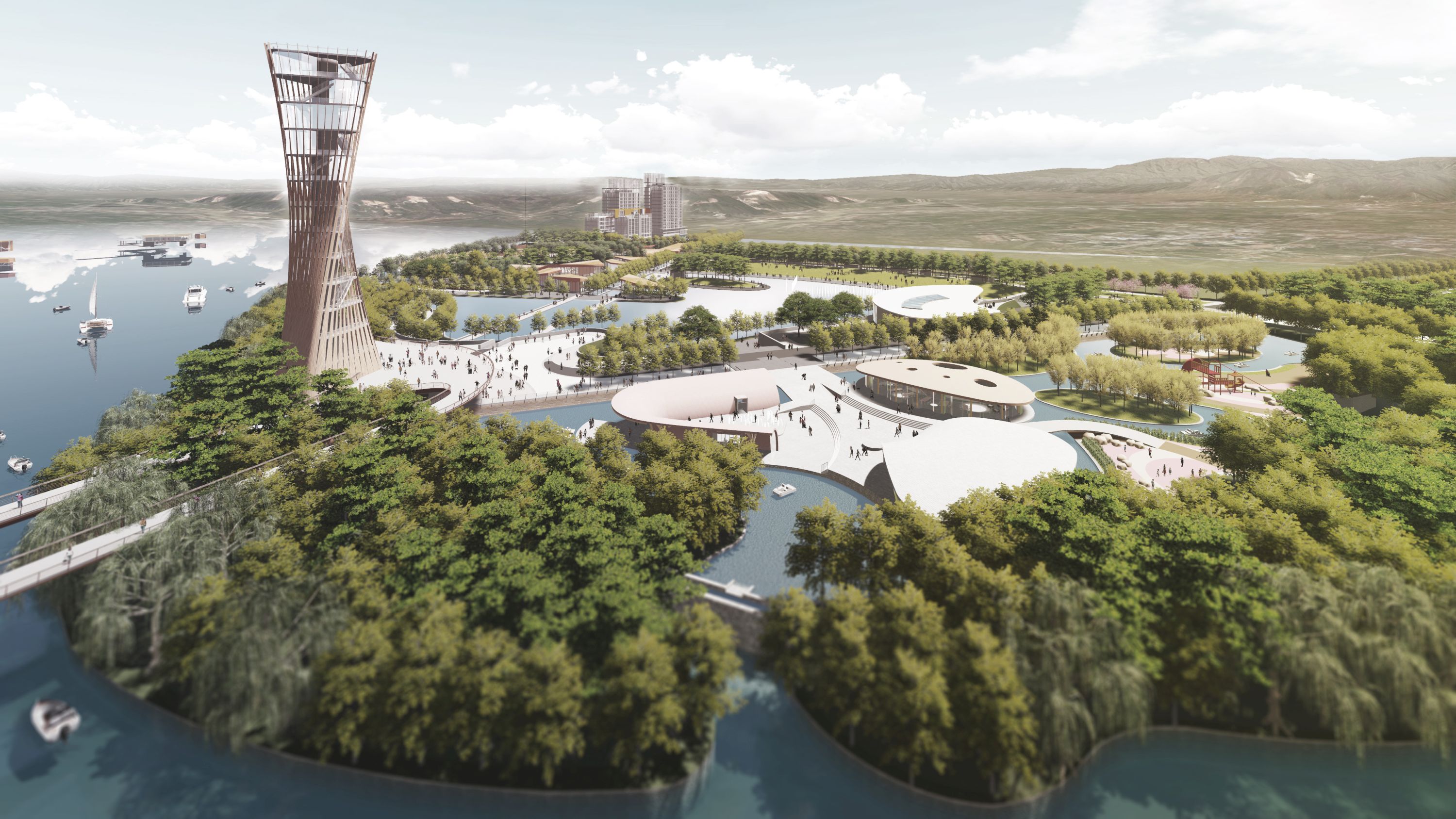 A landmark observation tower for a major eco-park in China, this structure rises from a triangular plan with softened, rounded corners that gently twist as it ascends. A series of vertical wooden fins wrap the form, rotating upward to frame moments of transparency where glass viewing platforms are revealed. The result is a sculptural, dynamic tower that offers panoramic views while expressing the park’s connection to nature and materiality.