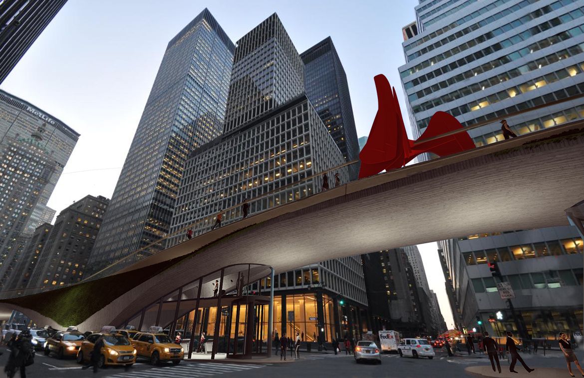 This proposal reimagines Park Avenue’s underutilized center median as a continuous, inhabitable pedestrian bridge. Rising gracefully from street level and touching down only at the existing medians, the arc-shaped structure creates an elevated linear park that threads through Midtown. Where the bridge meets the ground, programmed pavilions house cafés, yoga studios, and community spaces, activating what is currently passive urban residue. The green, sculpted surface above offers a new vantage point on the city—part infrastructure, part public realm—transforming Park Avenue into a vibrant, multi-level civic experience.