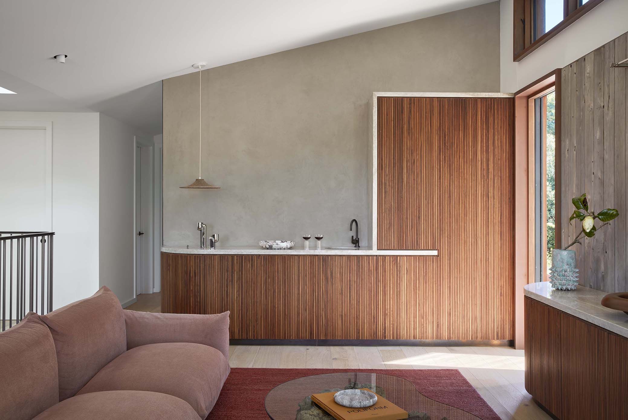 Custom Walnut Tambour cabinet with Taj Mahal Quartzite Stone